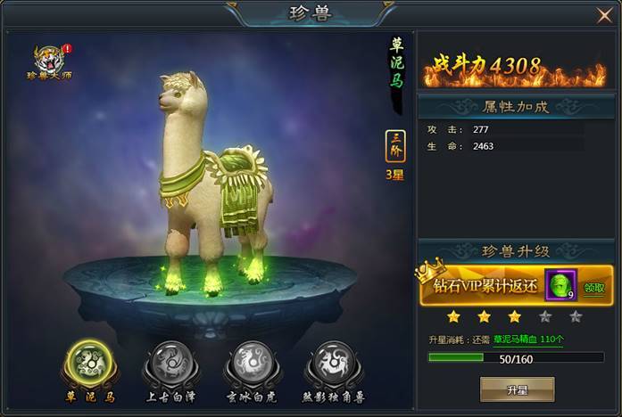 珍兽的的升级材料可以通过珍兽副本大量获得。激活钻石VIP,还可返还一定量进阶珍兽所消耗的精血。