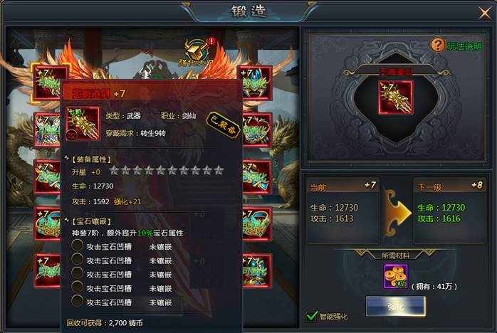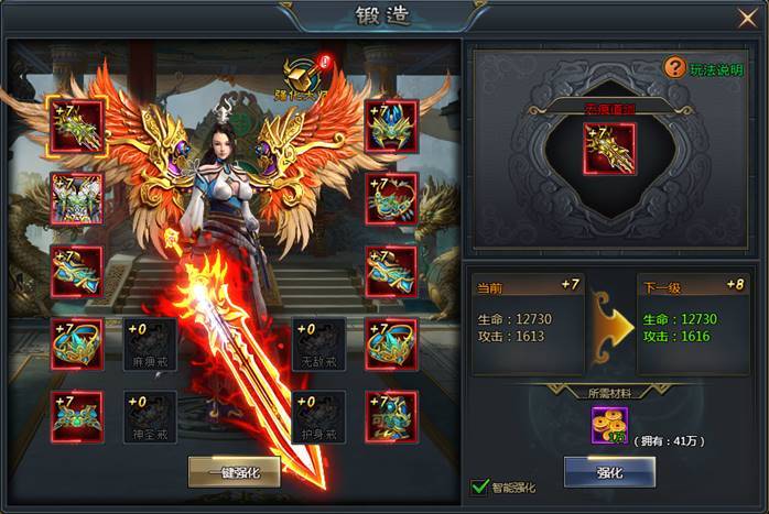 消耗金币即进行装备强化,提高装备属性,成功率100%。强化最高等级受角色等级限制(强化等级不超过角色等级)。