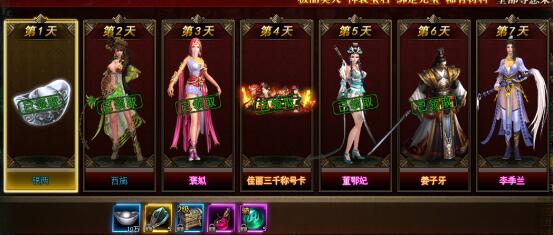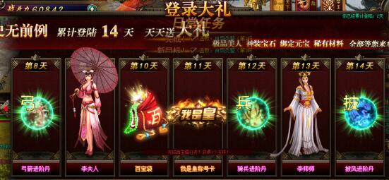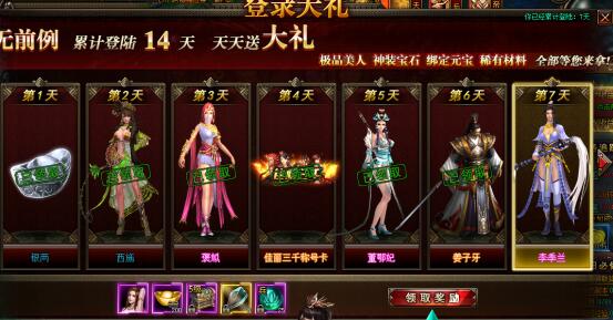 先看看第一天,除了10万银两还有2级宝石宝箱、培养石、一瓶攻击药水和5枚坐骑经验丹。再看傲天我是皇游戏中小编第七天的收获,除了美女李季兰,还可以收获200绑定元宝、五级宝石宝箱、8枚培养石以及25枚骑兵进阶丹。奖励不可谓不丰厚,这些都还是算最初的,越到后面奖励越多。不信我们打开第14天看一看就知道了。