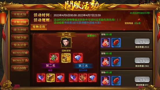 活动内容:开服前5天,每天开启一个冲榜活动,角色满足指定条件即可领取超多丰厚奖励